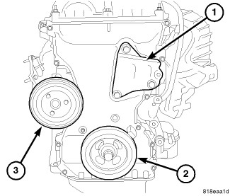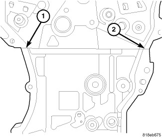 6. Apply 2 mm bead of Mopar(R) engine sealant RTV (or equivalent) to the engine block (1,2) as shown.
