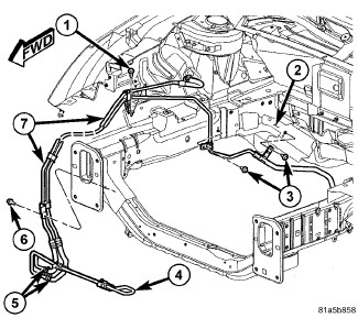2. Install the return hose routing clamp screw (1) securing the return hose (7) to the body.