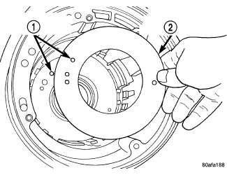 12. Compress low/reverse piston and install snap ring. Snap ring opening must be between spring levers (1)(Figure 12).