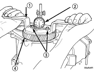 c. Using a Dial Indicator (2) (Figure 17) mounted to the transaxle case, measure output gear (4) end play.
