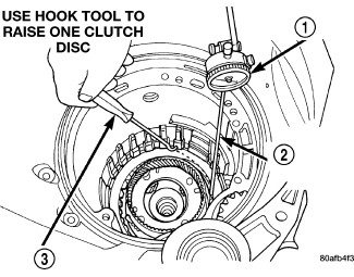 54. Set up Dial Indicator (1),(Figure 50) Indicator tip (3) and Hook tool (2), measure 2/4 clutch clearance. Press down on clutch pack with finger and zero dial indicator. 2/4 clutch pack clearance is 0.76-2.64 mm (0.030-0.104 in.). Set up indicator and record measurement in four places. Take average of readings. If clearance is outside this range, the clutch is assembled improperly. There is no adjustment for 2/4 clutch clearance.