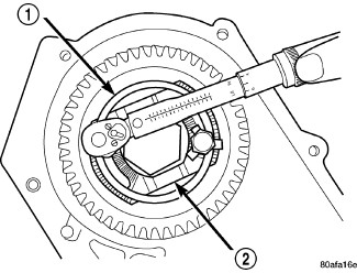 60. Using the Turning Torque Tool (1) and an inch pound torque wrench (2) check the differential turning torque, it should be 1.0-2.5 Nm (10 to 22 in-lbs drag). If turning torque is more than 2.5 Nm (22 in-lbs drag) decrease shim size behind the end cover and recheck. If turning torque is less than 1.0 Nm (10 in-lbs drag) increase shim size.
