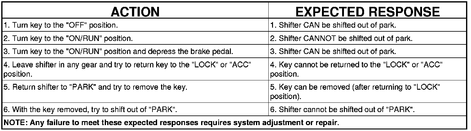 The following chart describes the normal operation of the Brake Transmission Shift Interlock (BTSI) system. If the "expected response" differs from the vehicle's response, then system repair and/or adjustment is necessary.