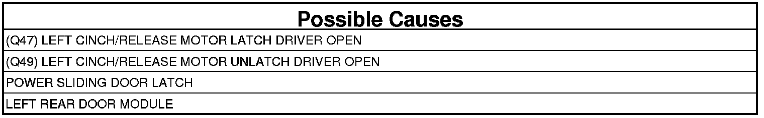 This code will set when the Left Rear Door Module senses no current on the Latch Cinch/Release circuit during a Cinch/Release operation for more than 100ms.