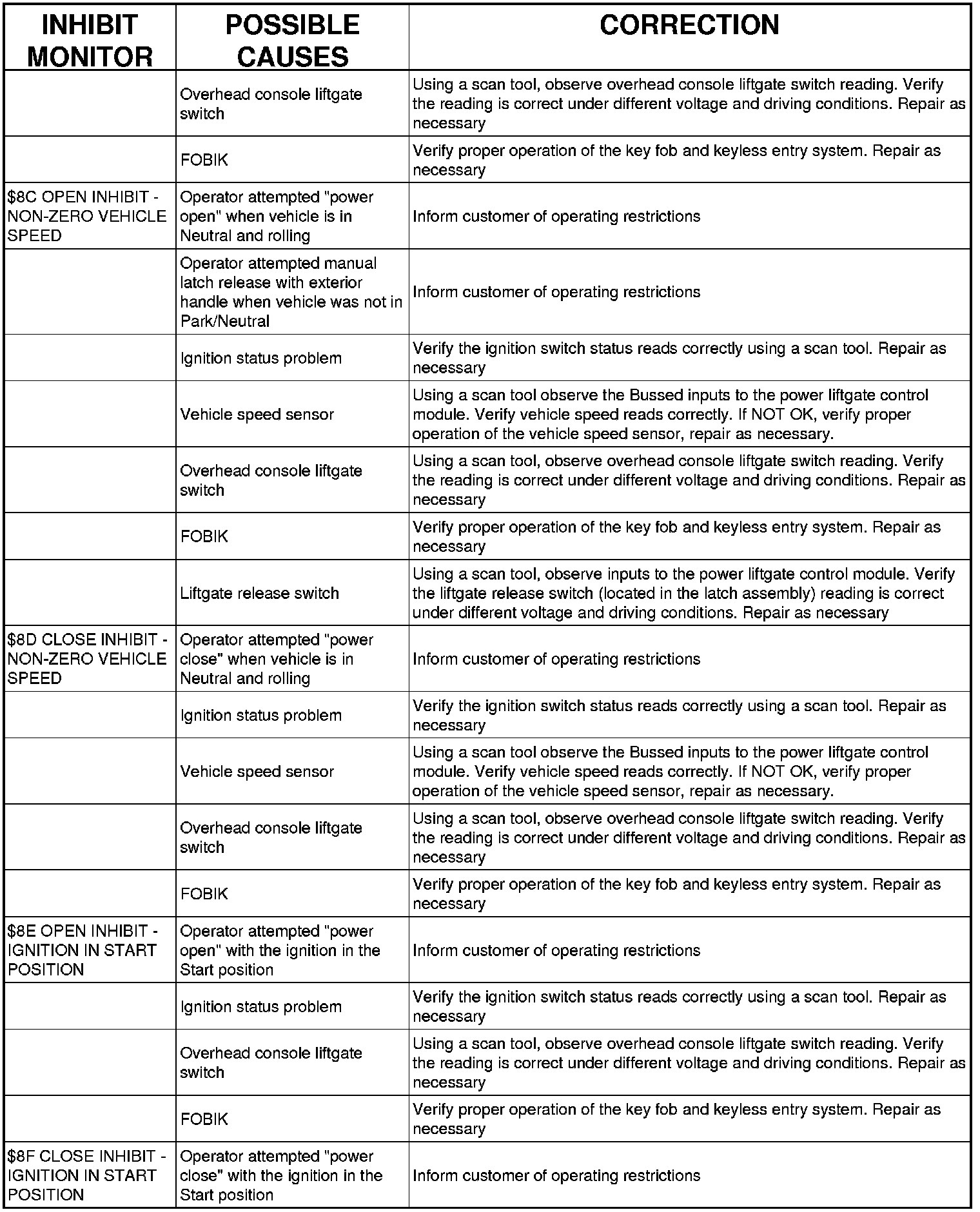 POWER LIFTGATE SYSTEM INHIBIT MONITORS TABLE