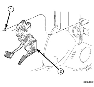 7. Remove two nuts (1) fastening pedals assembly (2) to dash panel.