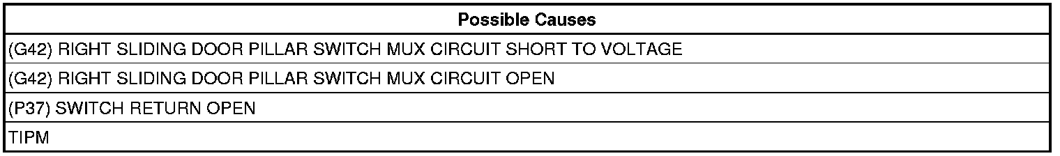 When the TIPM senses voltage over 5.2 volts on the (G42) Right Sliding Door Pillar Switch circuit for longer than 10 seconds, this code will set.