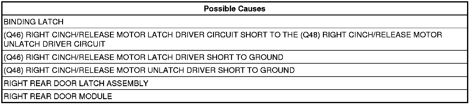 - Repair the (Q46) Right Cinch/Release Motor Latch Driver circuit for a short to the (Q48) Right Cinch/Release Motor Unlatch Driver circuit.