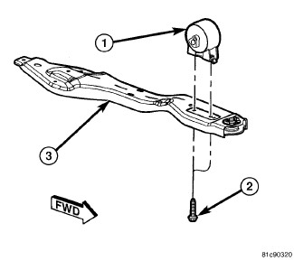1. Install the front engine mount (1) onto the crossmember (3). Install the mounting bolts (1) and tighten to 55 Nm (41 ft. lbs.).