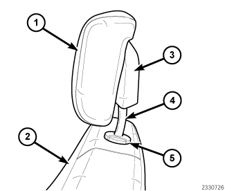 Active Head Restraint (AHR) units are available equipment for both front seating positions in this vehicle. On vehicles so equipped, one AHR unit is located atop each front seat back (2). An AHR can be readily distinguished from a non-active head restraint by the two-piece construction used for an AHR. The forward-facing pad (1) consists of a molded reinforced plastic convex form covered with a dense foam pad and is trimmed in a material coordinated with the other soft trim on the seat. The rearward-facing surface is equipped with a hard molded plastic trim cover (3) that matches the other hard trim on the seat.