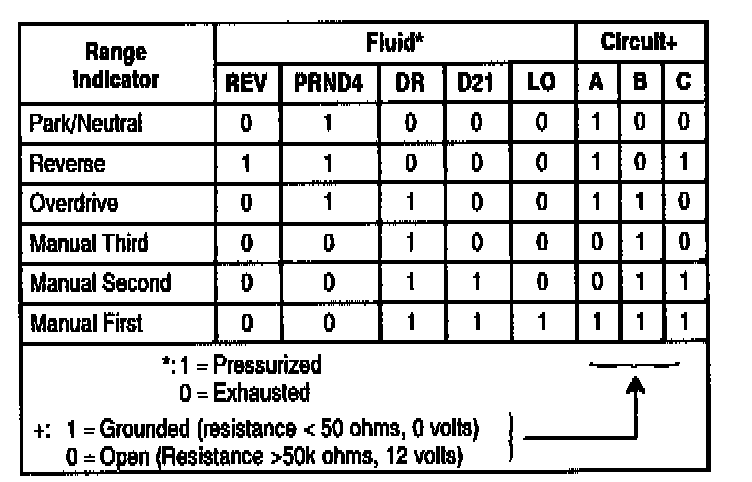 Each fluid pressure switch produces either an open or ground to the PCM depending on the presence of fluid pressure at the switches. The sequence of open and closed switches produces a combination of voltage readings that are monitored by the PCM (see chart and switch logic diagram).