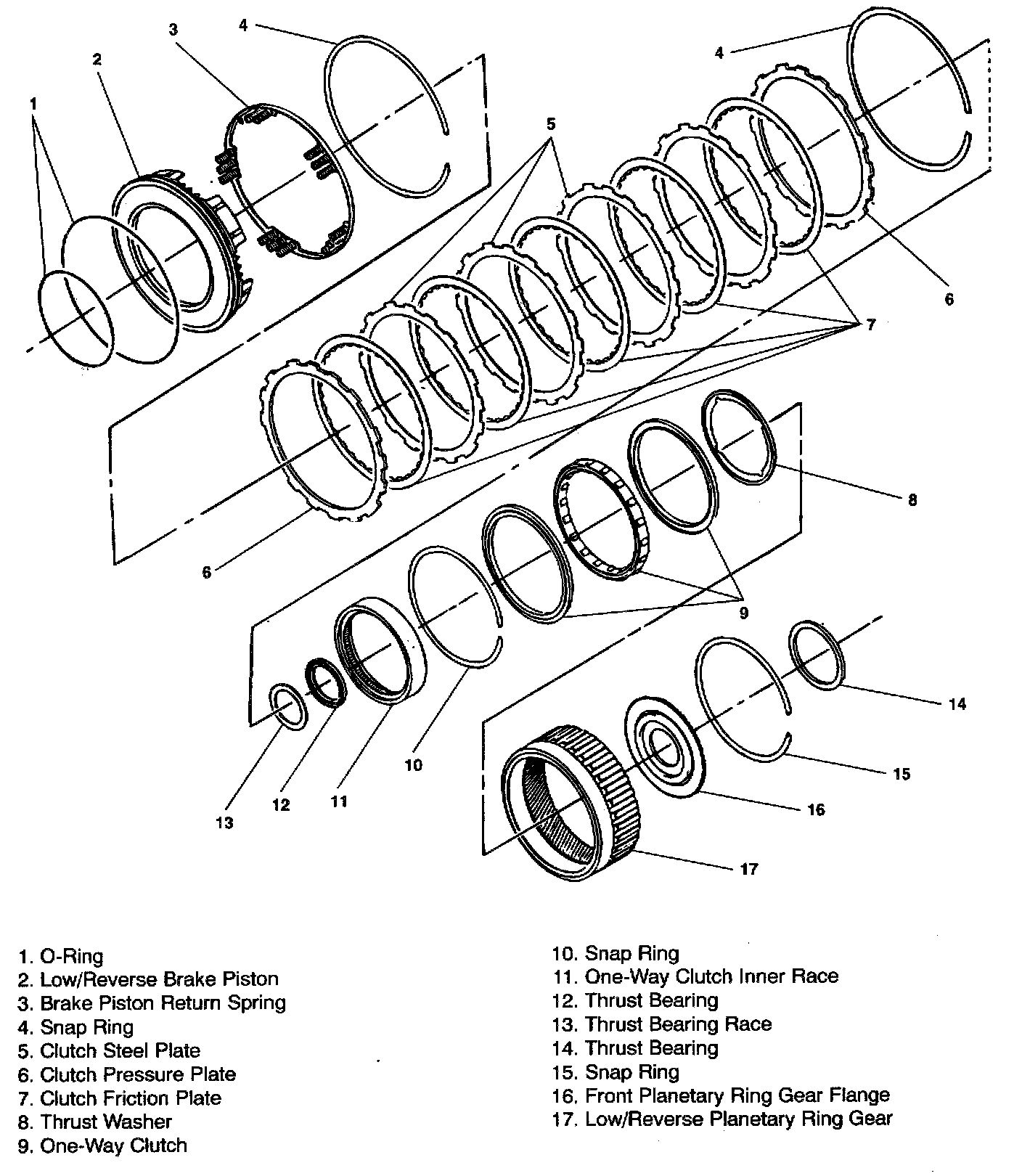 LOW/REVERSE BRAKE CLUTCH PISTON ASSEMBLY, FRONT PLANETARY RING GEAR AND ONE-WAY CLUTCH