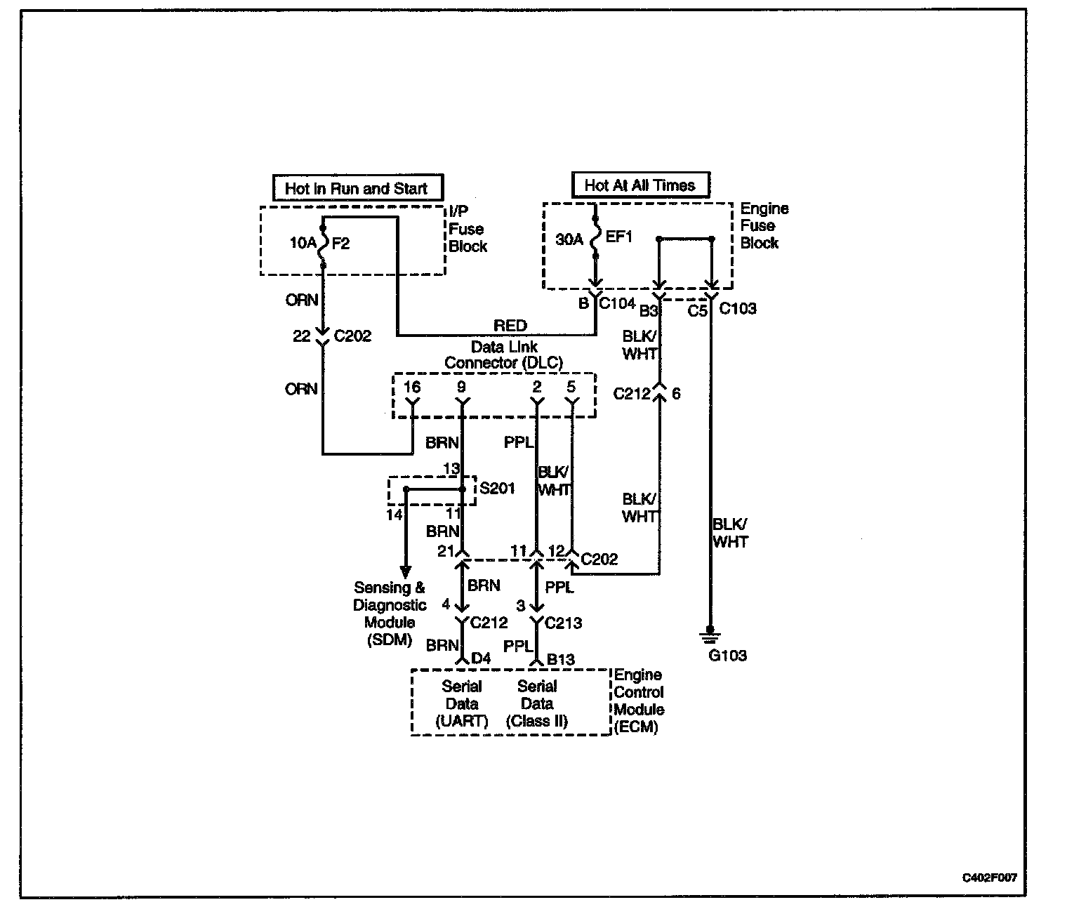 The provision for communicating with the Engine Control Module (ECM) is the Data Link Connector (DLC). It is located under the instrument panel. The DLC is used to connect the scan tool. Battery power and ground is supplied for the scan tool through the DLC. The Class II serial data circuit to the DLC allows the ECM to communicate with the scan tool. A Universal Asynchronous Receiver Transmitter (UART) serial data line is used to communicate with the other modules such as the Electronic Brake Control Module (EBCM), the Supplemental Inflatable Restraint (SIR) system and the Instrument Panel Cluster (IPC).
