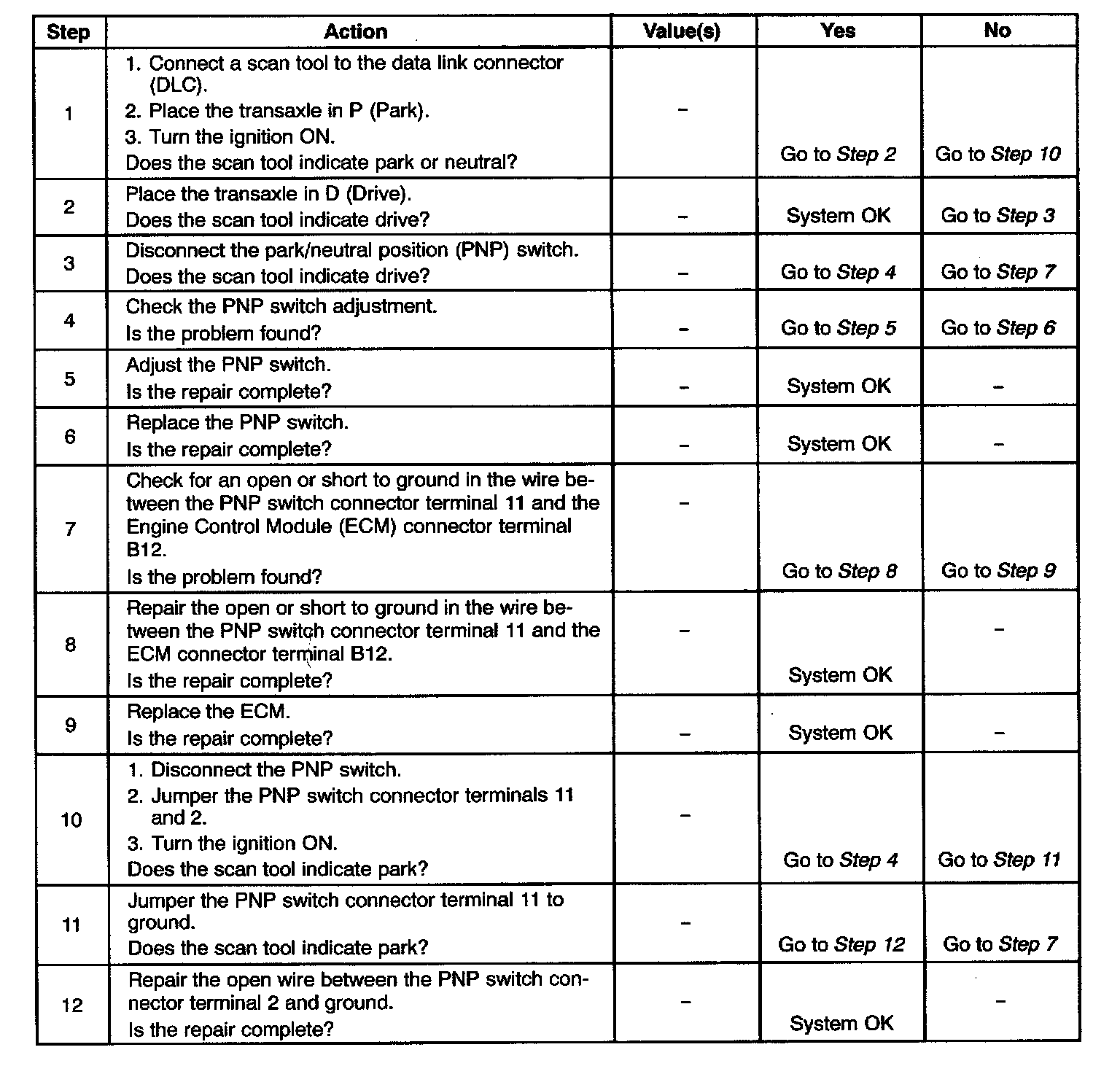 1. Checks for the Park/Neutral Position (PNP) switch closed to ground in the park position. Different makes of scan tools will read park/neutral differently. Refer to the tool operations manual for the type of display used.