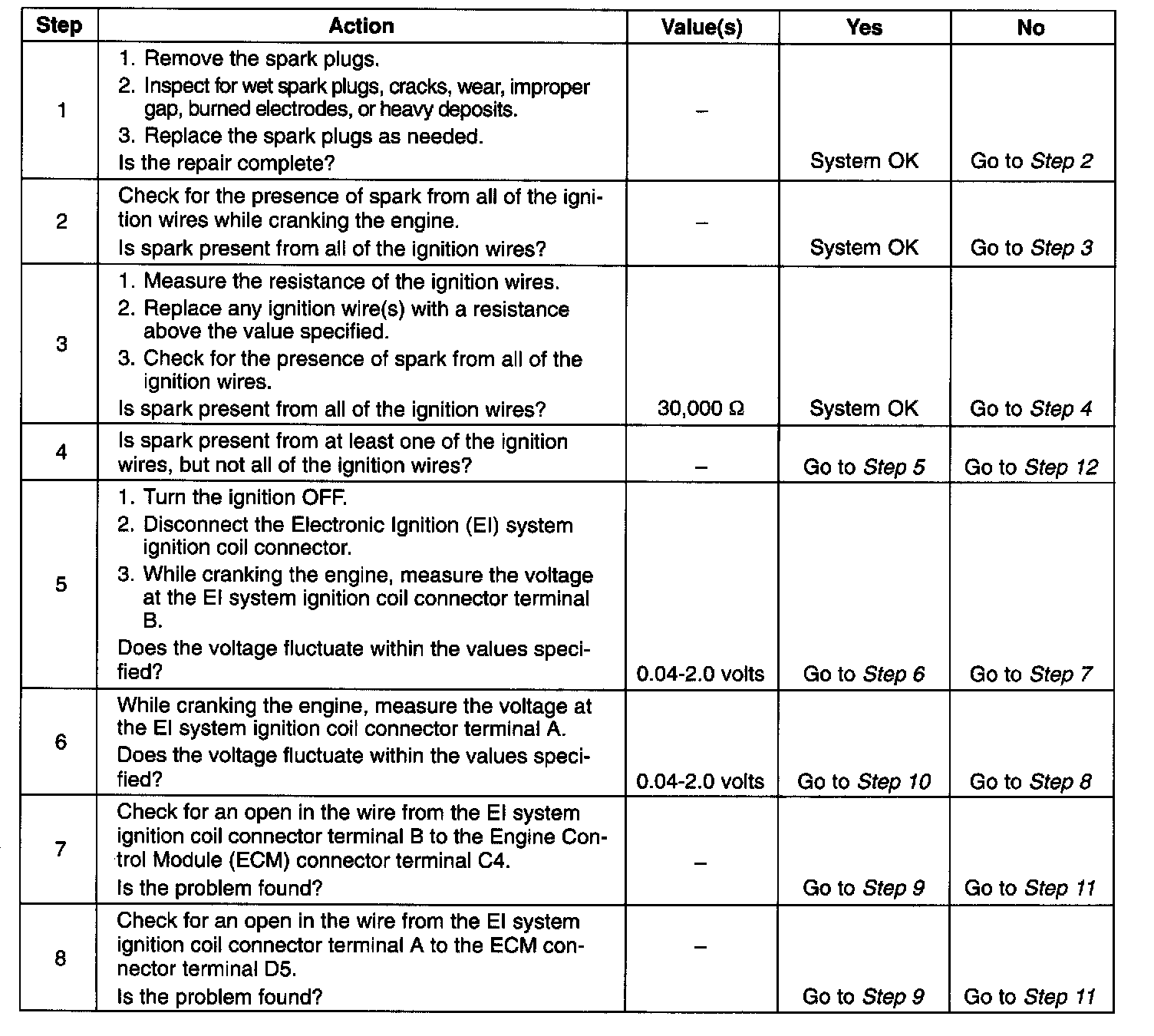 6. After confirming ECM inputs for the electronic spark timing to the EI system ignition coil are OK, it can be determined that a faulty EI system ignition coil is at fault.