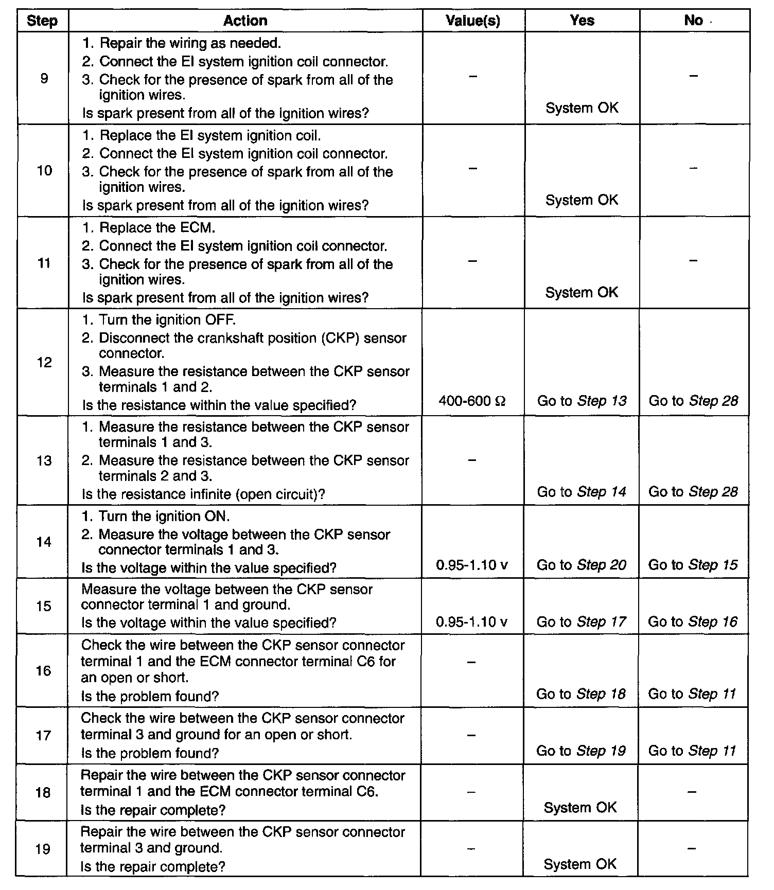 11. After confirming proper crankshaft position sensor inputs to the ECM and no wiring problems present, it can be determined that the ECM is at fault.