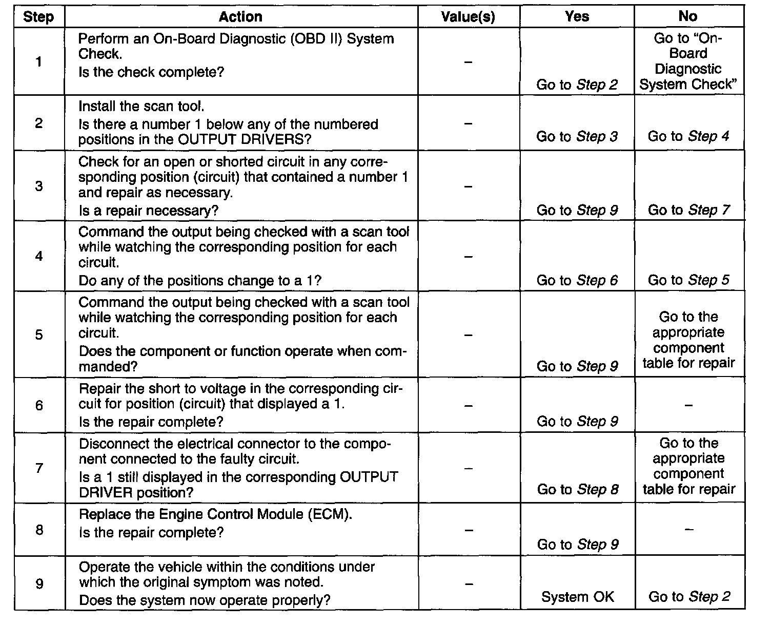 4. An open or short to ground will appear in the open positions on the scan tool only when it is not commanded by the ECM or scan tool, while a short to voltage will appear in the short positions on the scan tool only while the component is being commanded by the ECM or scan tool.