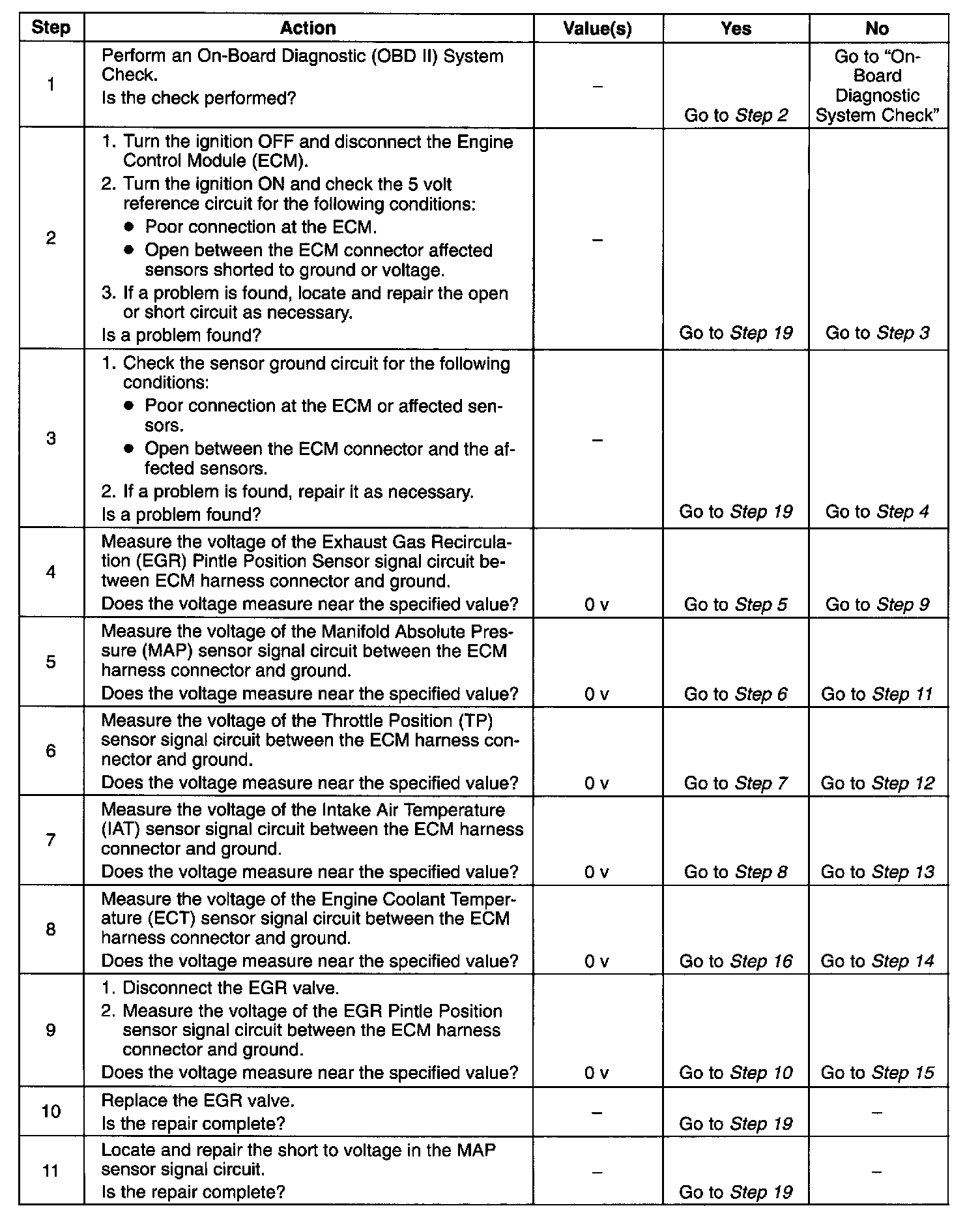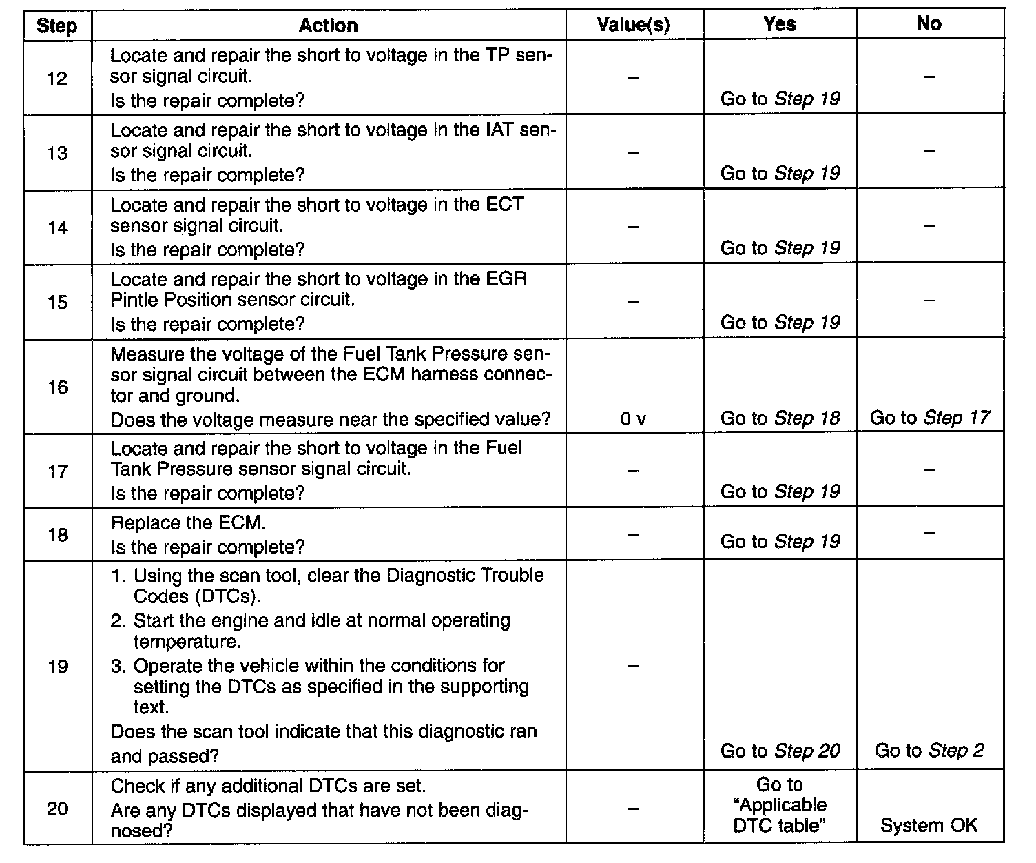 12 - 19. If a sensor input circuit has been shorted to voltage, ensure that the sensor has not been damaged. A damaged IAT or ECT sensor will continue to indicate a high voltage or low temperature after the affected circuit has been repaired. A damaged Air Conditioning Pressure (ACP), TP, MAP, Fuel Tank Pressure, or EGR Pintle Position sensor will indicate a high or low voltage or may be stuck at a fixed value after the affected circuit has been repaired. If the sensor has been damaged, replace it.