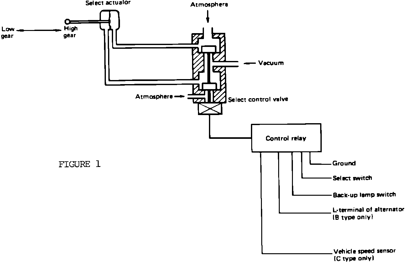 NOTE: THE SELECT CONTROL VALVE SWITCHES VACUUM APPLIED ON THE SELECT ACTUATOR ACCORDING TO A SIGNAL SENT FROM THE CONTROL RELAY. THE SELECT ACTUATOR THEN SHIFTS HIGH AND LOW GEARS ON THE INPUT SHAFT.