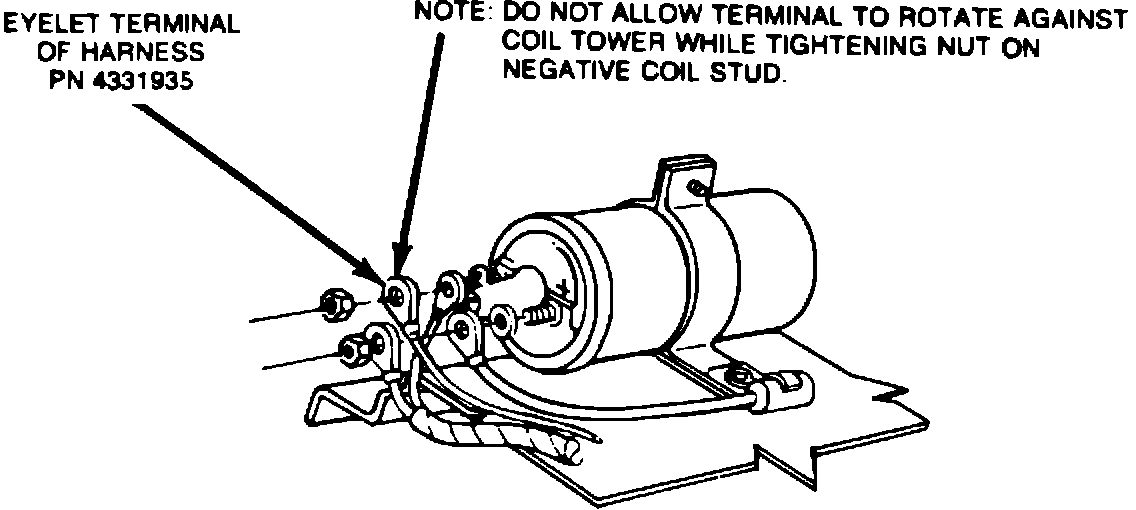 3. Install the bare eyelet terminal of the engine compartment overlay harness, PN 4331935, to the negative terminal of the ignition coil as shown in Figure 1-A.