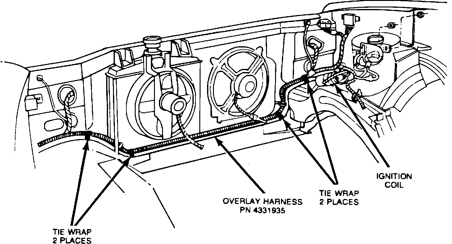 4. Route the overlay harness along the existing headlamp-to-dash main harness from the coil forward to radiator cowl panel, then toward the left side of the engine compartment under fans and radiator as shown in Figure 1-B. Then route harness upward and toward the rear of the engine compartment to the bulkhead connector as shown in Figure 1-C. Pass it through the large retainer clip nearest the bulkhead connector. Secure the overlay harness by using existing wiring clips and six tie wraps, PN 6015756, as shown in Figures 1-B and 1-C.