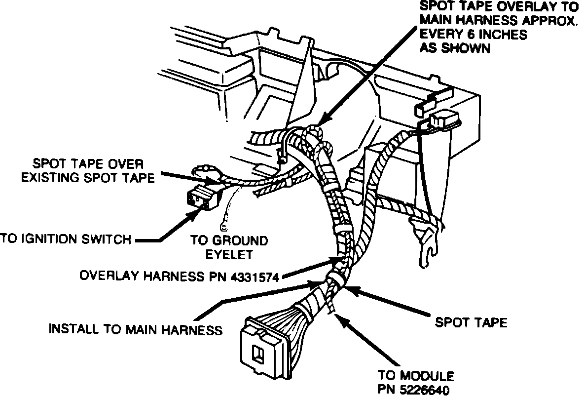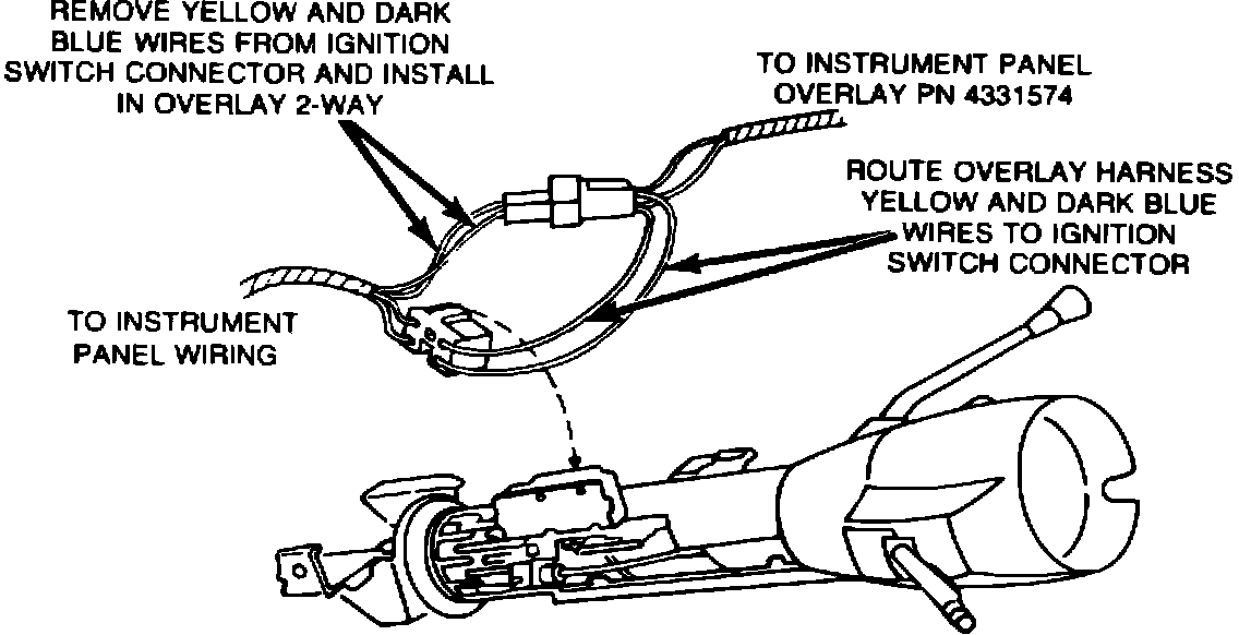 Install the bare terminal yellow wire of the instrument panel overlay harness, PN 4331574, into the previously vacated cavity in the ignition switch connector (Figures 2-C and 7).