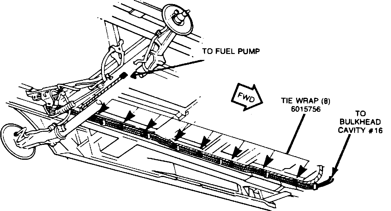 2. Insert the "basket handle" type clip into the existing ring clip on rear crossmember. Route the harness along the rear crossmember to the left frame rail. Secure the harness using two tie wraps, PN 6015756 (Figure 3-A).