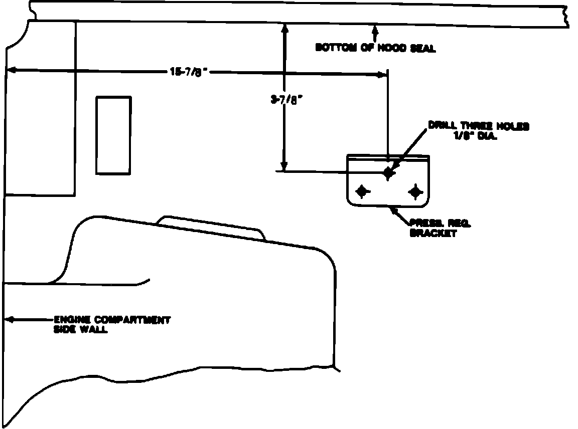 1. On the right side of the dash panel mark the location of the pressure regulator bracket top attaching hole as shown in Figure 4. Center punch and drill a 1/8" diameter hole and attach pressure regulator bracket, PN 4306972, with selftapping screw, PN 6031991. (Position the bracket so its top surface is horizontal and tighten screw securely.) Drill 1/8" diameter holes in the center of the two lower bracket holes. Install the remaining two screws, PN 6031991, and tighten securely.