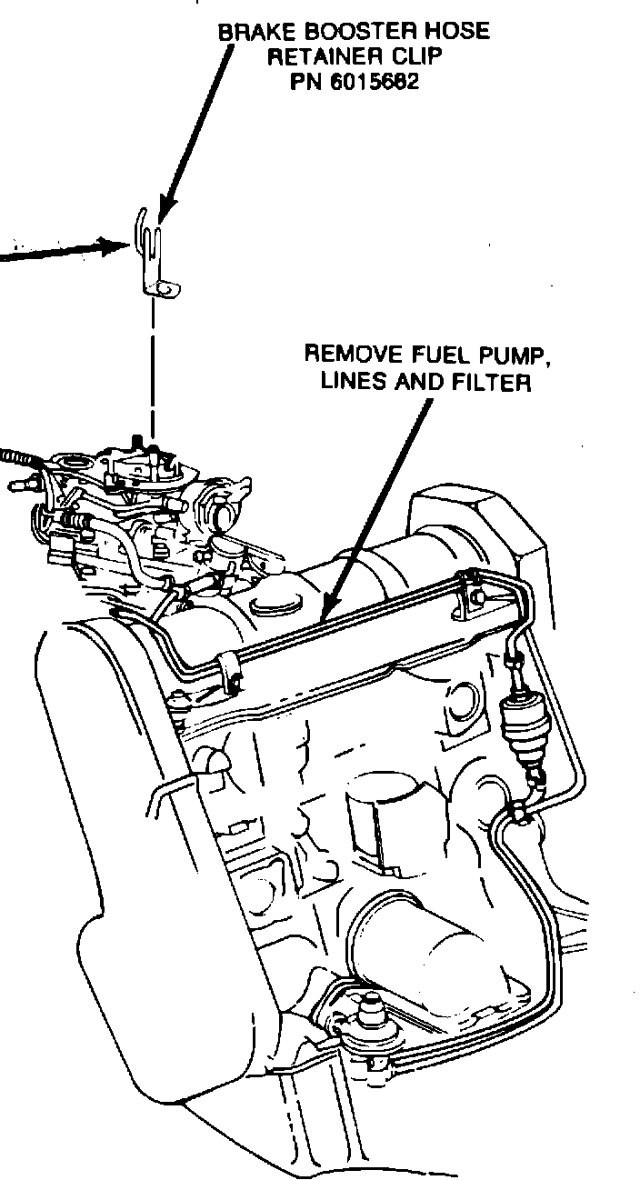 NOTE: BEFORE INSTALLING RADIATOR SIDE AIR CLEANER CROSSOVER WING NUT, SLIP BRAKE BOOSTER HOSE RETAINER CLIP, PN 6015682, OVER CARBURETOR AIR CLEANER STUD. (MIDDLE FINGER FACING RESERVOIR) INSTALL WING NUT AND ROUTE BRAKE BOOSTER HOSE IN CLIP, BENDING FINGERS OF CLIP AROUND HOSE TO HOLD IN PLACE (FIGURES 5-A AND 5-B).