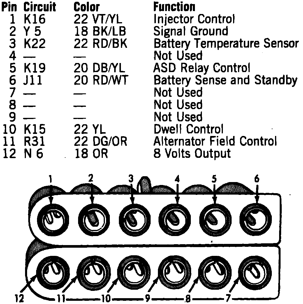 Fig. 14 Power module 12 pin connector terminal identification. 1987 models: