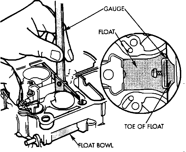 3. Measure the height of the float from the top of the casting to the top of the float at a point 4.8 mm (3/16 in.) from the end of the float. The float level should be within 1.59 mm (1/16 in.) of the listed specification, refer to SPECIFICATIONS for correct setting based upon carburetor number.