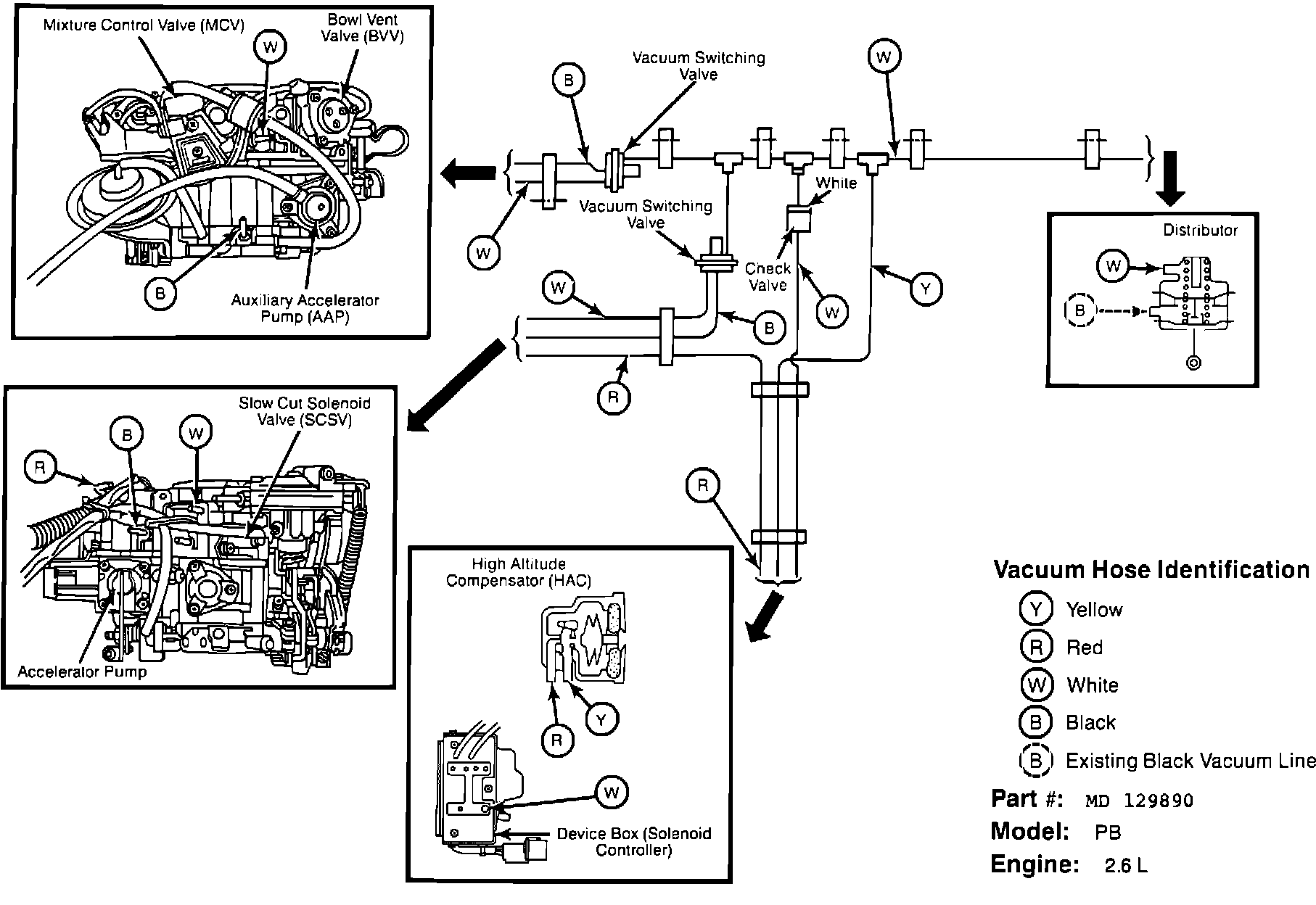 NOTE: WHEN INSTALLING THE VACUUM HARNESS, YOU WILL USE THE EXISTING DISTRIBUTOR VACUUM SUPPLY HOSE ALONG WITH THE NEW VACUUM HARNESS TO CONNECT TO THE DUAL DIAPHRAGM DISTRIBUTOR INSTALLED PREVIOUSLY. ALL CONNECTIONS ARE IDENTIFIED WITH COLOR CODING AND ARE ILLUSTRATED ON DIAGRAMS PROVIDED.