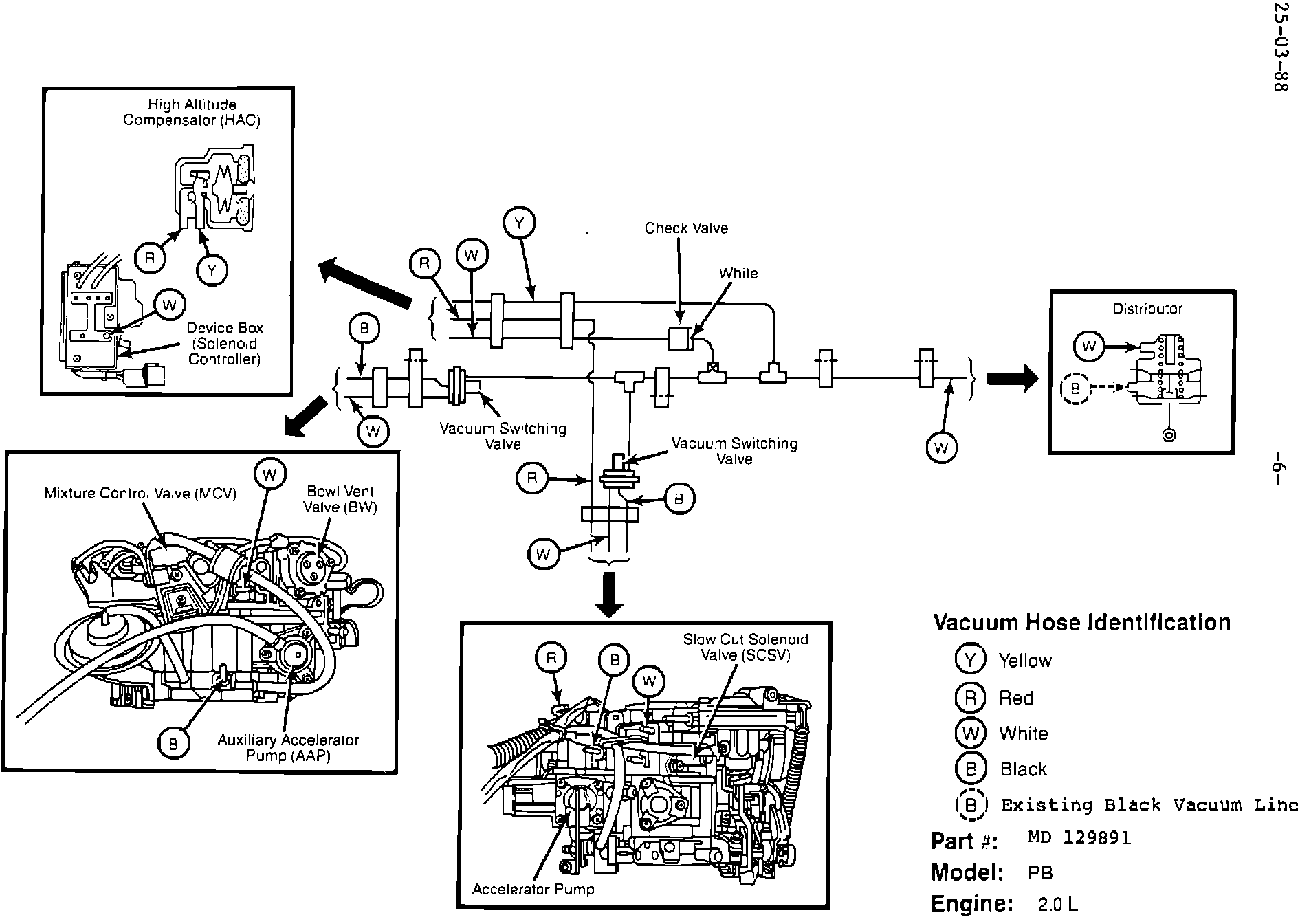 4. Using the appropriate attached diagram, install the vacuum harness assembly supplied in package, and connect hoses to carburetor, HAC (high altitude compensator), and distributor.
