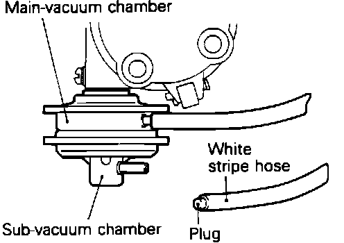 3. When testing ignition timing at altitudes above 3,900 ft. disconnect the white striped vacuum hose from the sub-vacuum chamber of the distributor and plug the hose end.