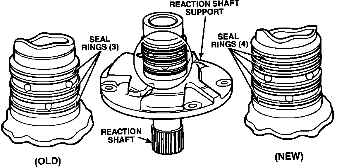 Inspect the front pump reaction shaft support. If the reaction support has three ring grooves, replace it with the four ring reaction support supplied in the repair package (Figure 1). If the reaction support that is removed from the transaxle has four ring grooves, the repair package is not needed.