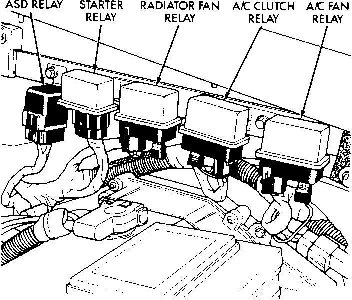 The ASD relay is found on the left inner fender apron near the left strut tower and the diagnostic connector.