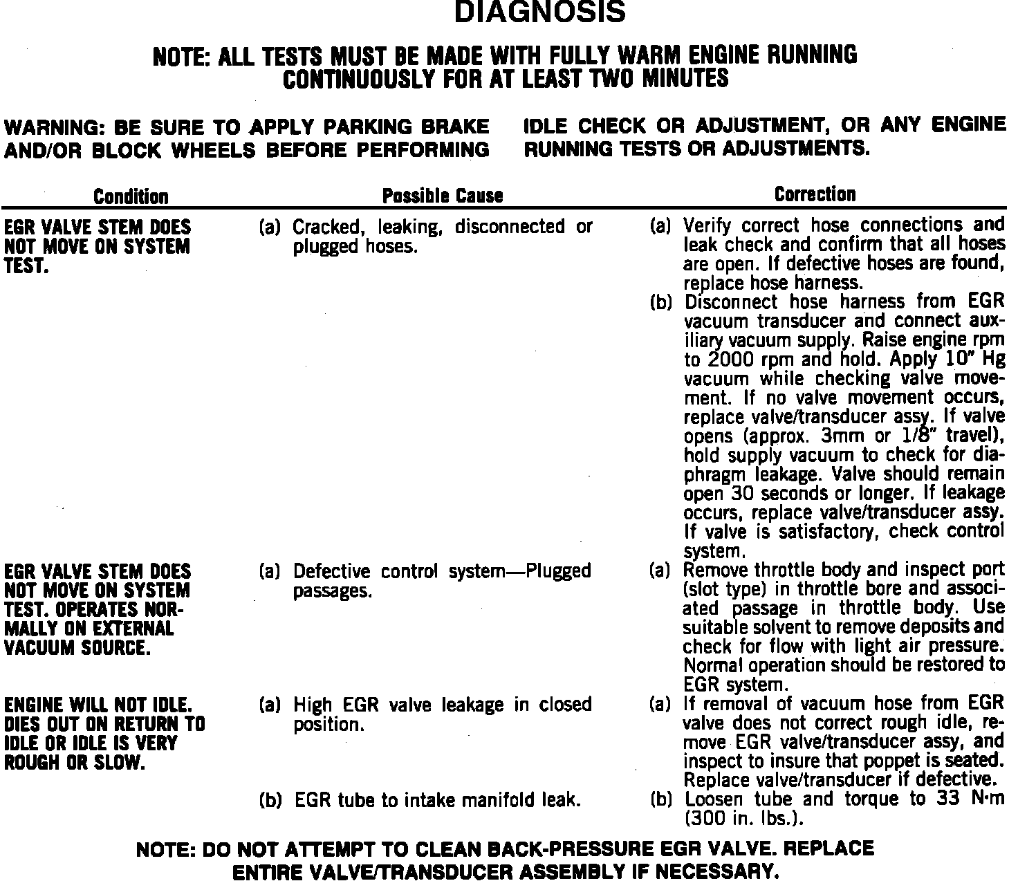 7. If engine rpm does not drop when vacuum is applied to the EGR vacuum diaphragm, then a defective EGR valve or plugged EGR passage, or tube is indicated. The EGR valve, intake manifold passage, and tube assembly should be removed, inspected, and cleaned or replaced. Refer to MAINTENANCE PROCEDURES for cleaning and inspection procedures for the EGR valve and passages.