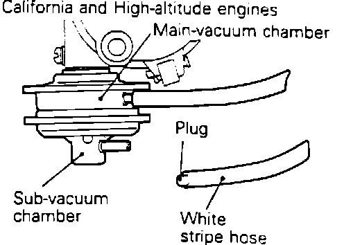 NOTE: For high altitude (2,900 ft. or more) and California vehicles, disconnect the white stripe vacuum hose from the sub-vacuum chamber of the distributor and plug hose end.