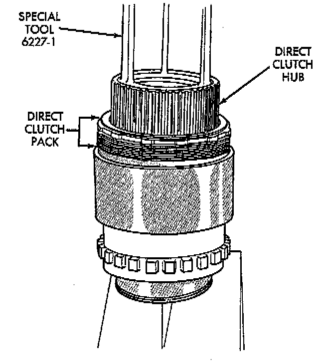 WARNING: The next step in disassembly involves compressing the direct clutch spring. It is extremely important that proper equipment be used to compress the spring as spring force is approximately 830 pounds. Use spring compressor tool 6227-1, or equivalent and a hydraulic shop press with a minimum ram travel of 5 - 6 inches. The press must also have a bed that can be adjusted up or down as required. Release clutch spring tension slowly and completely to avoid personal injury.