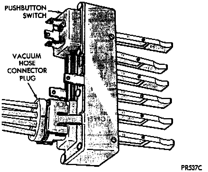 Disconnect engine vacuum source hose at engine intake manifold and insert vacuum tester hose prod into source hose leading to control switch. Place vacuum gauge on the cowl so it can be observed from the driver's position as push buttons are operated.