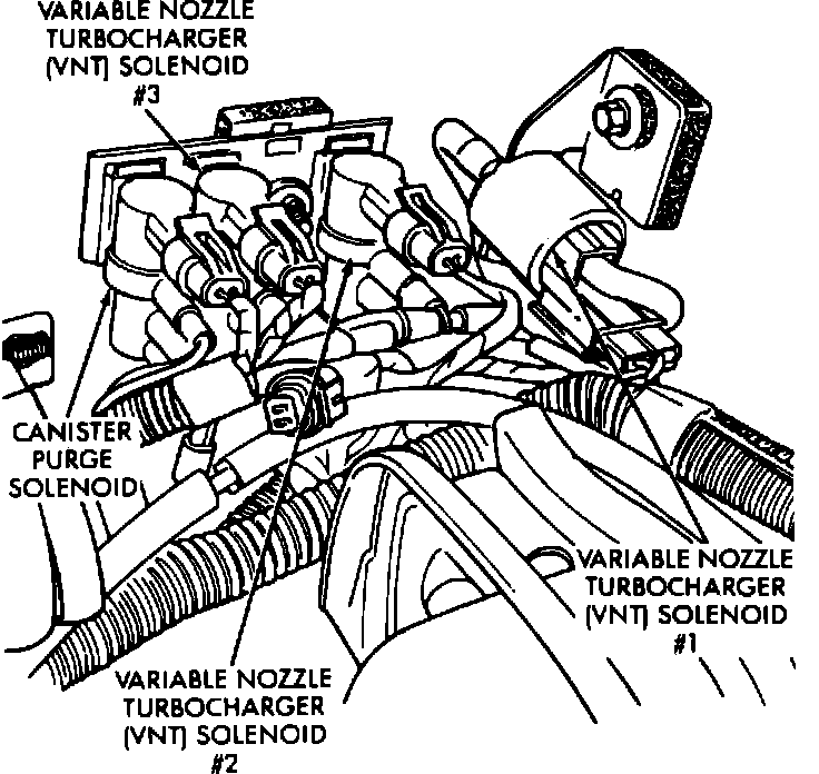 2. Check the canister purge solenoid and the VNT #3 solenoid vacuum and electrical connections.