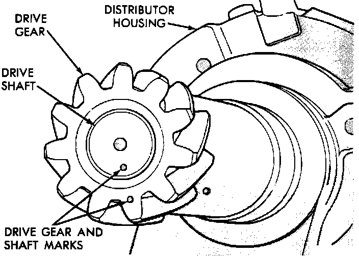 2. Install distributor drive gear on shaft, taking care to ensure proper alignment with reference marks made during disassembly, and install roll pin.
