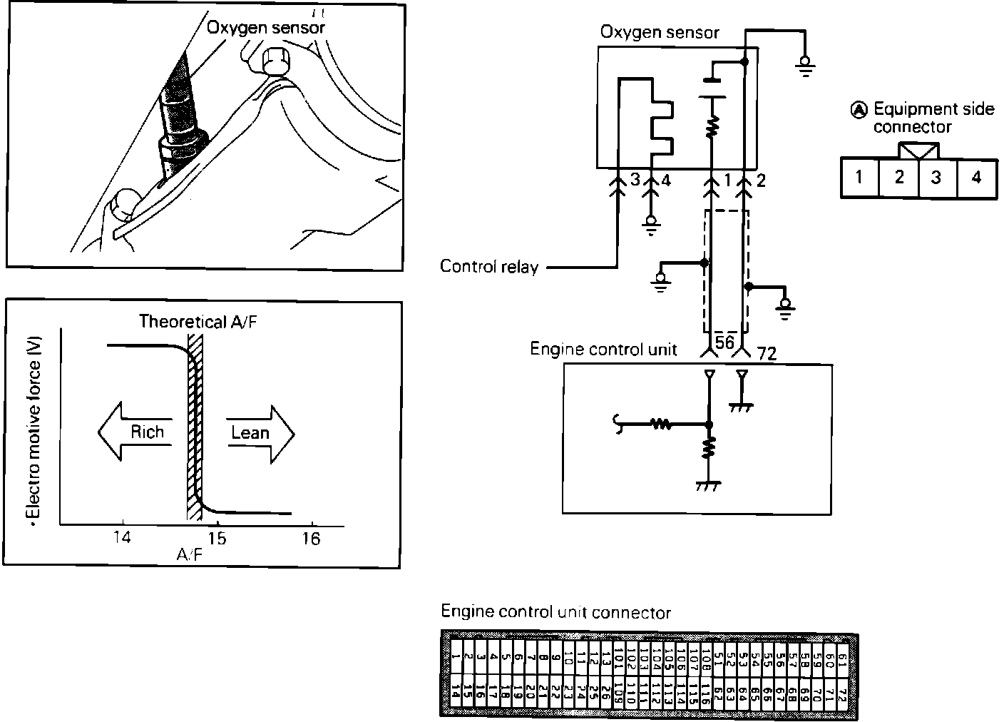 2. Using an Ohmmeter, check for continuity between the ECU harness connector terminal 56 and the oxygen sensor harness connector terminal 1.