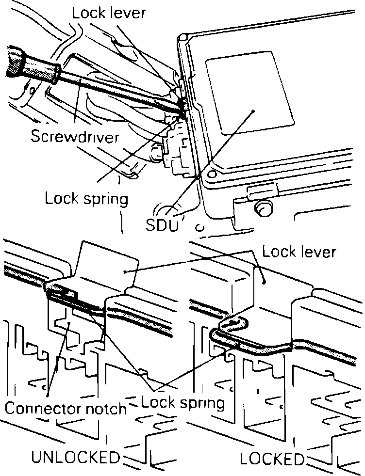 5. Use a screwdriver to push in the lock spring of the lock lever on the SRS control unit to unlock the lock lever.