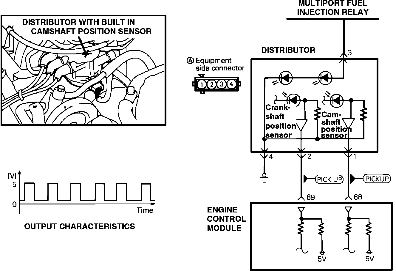 1. Connect a voltmeter between terminal 2 (Crankshaft Position signal), and 4 (Sensor ground), of the crank angle sensor connector.