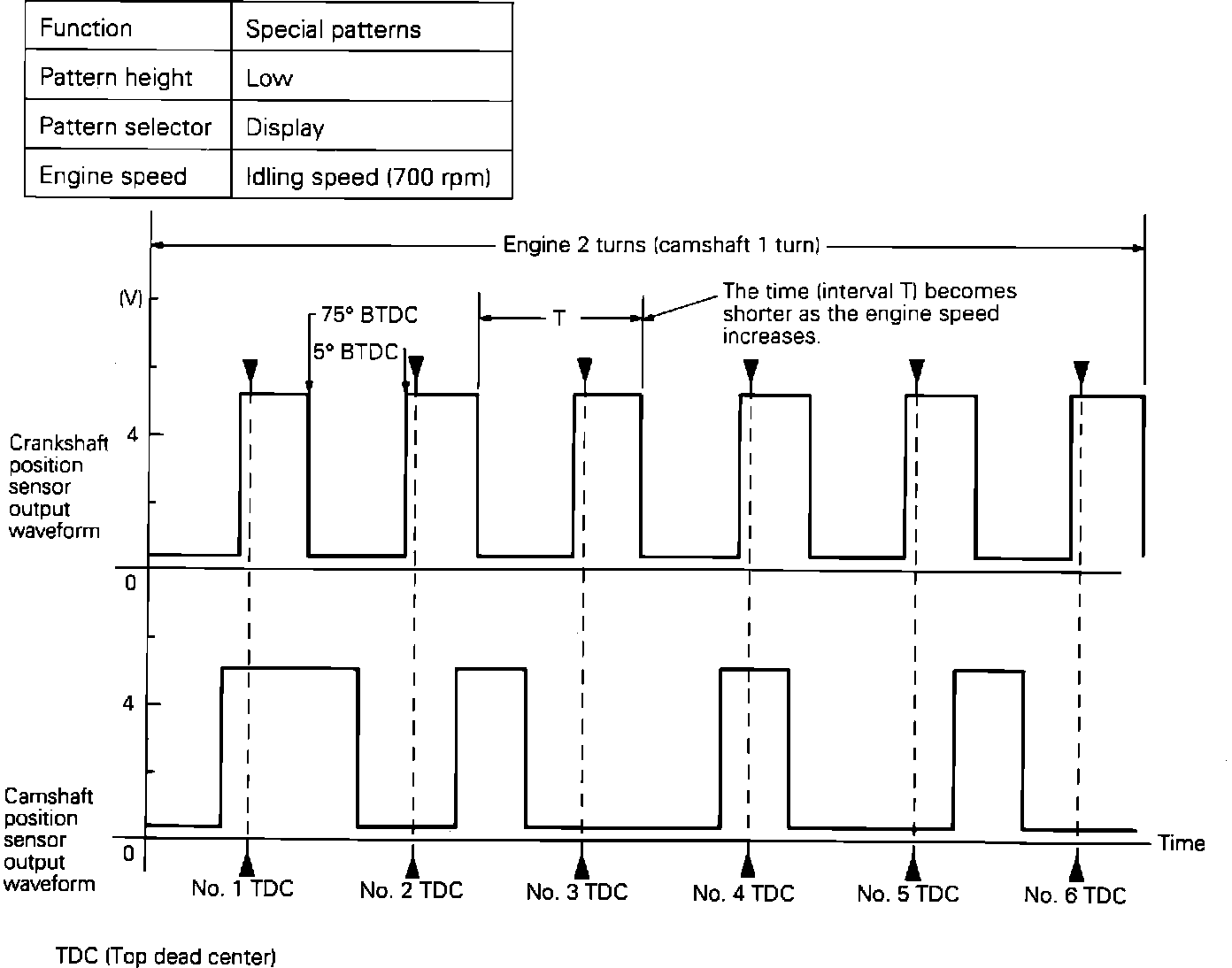 1. Disconnect the crankshaft position/camshaft (TDC) sensor connector and turn the key to the ON position.