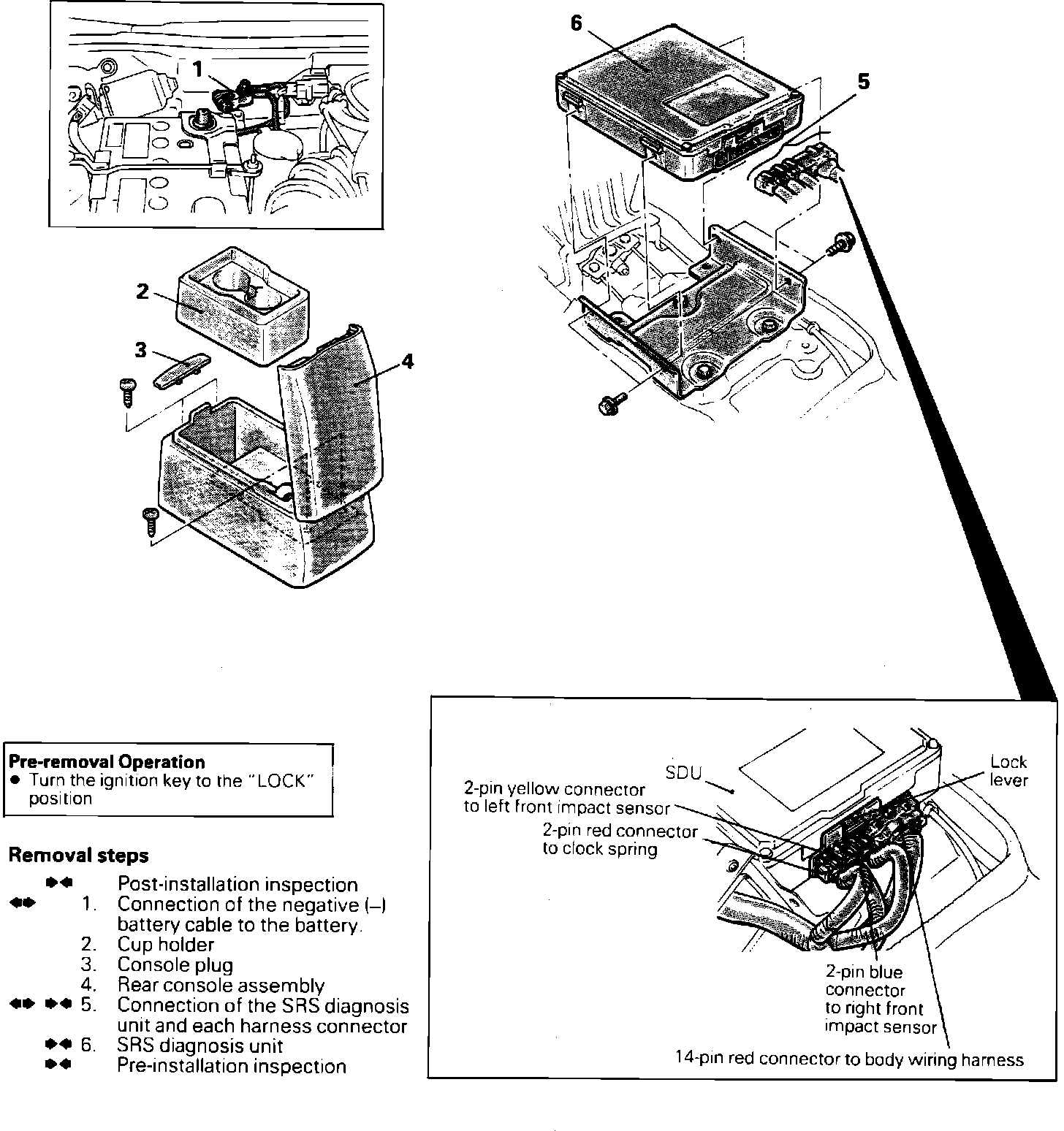 4. Disconnect the red 14-pin connector from SRS diagnosis unit while pressing down the lock of connector.
