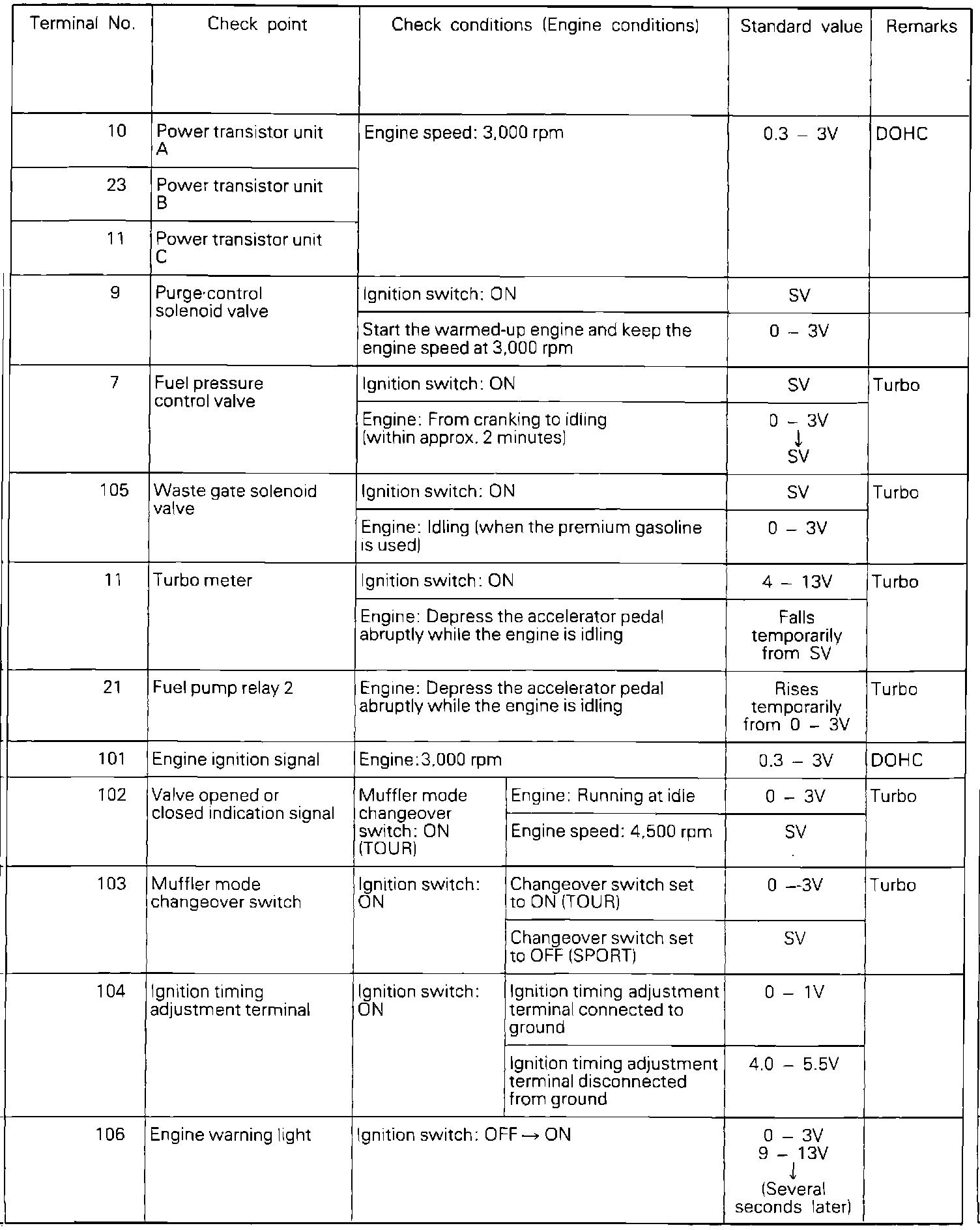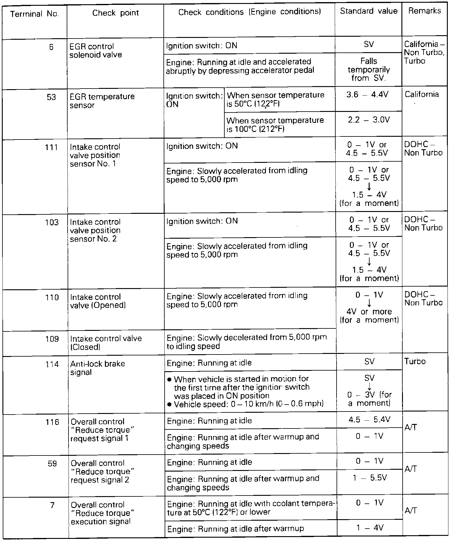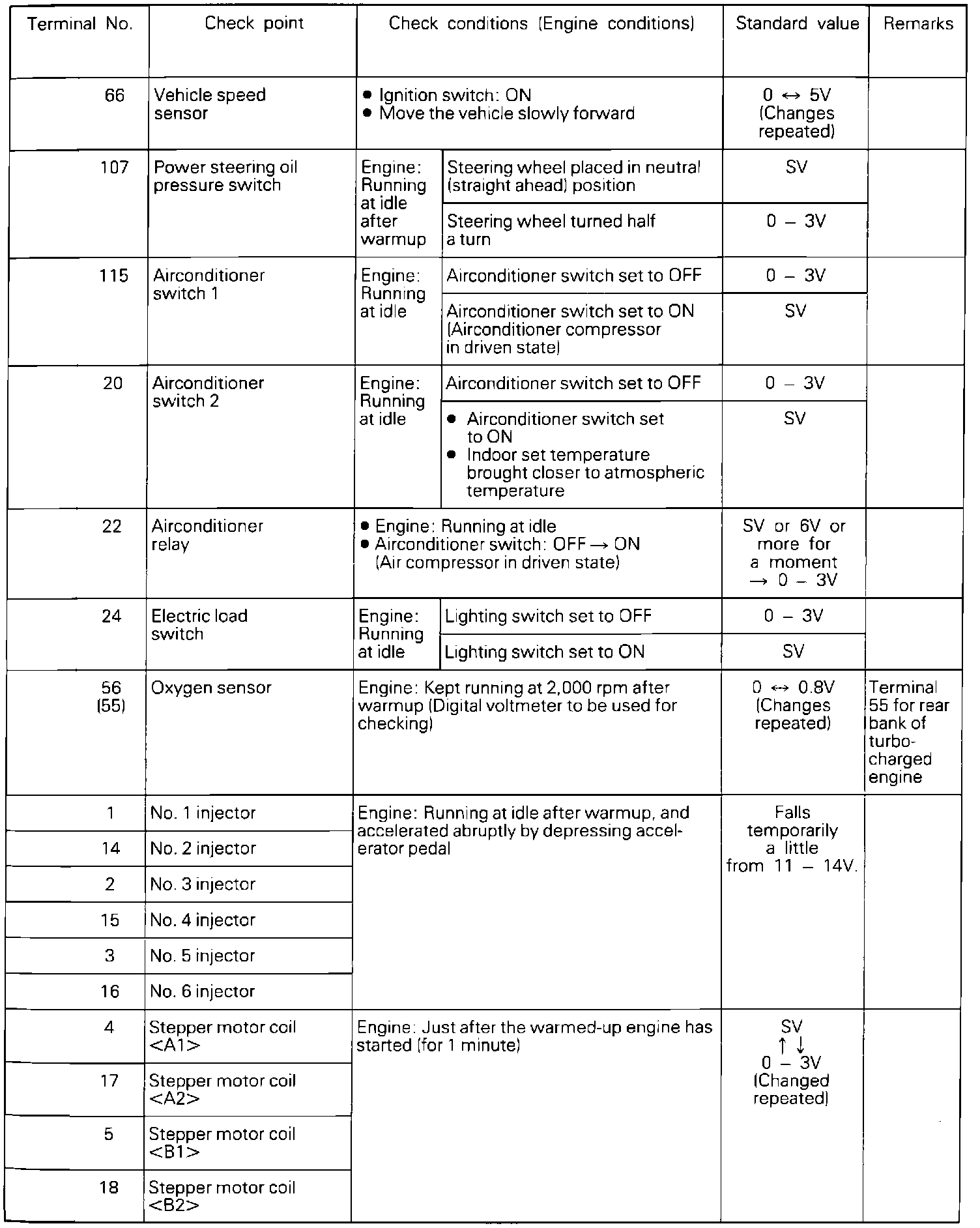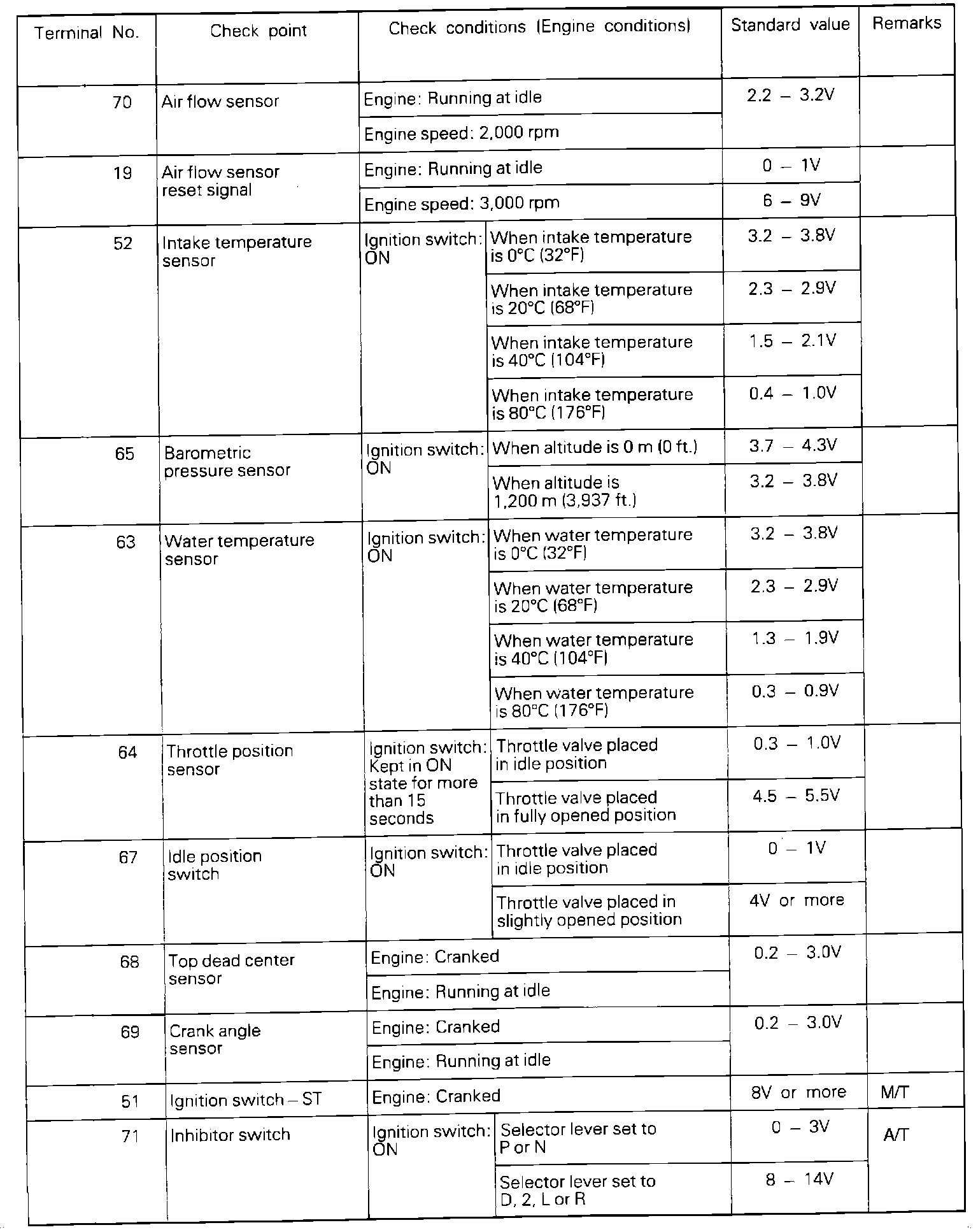 If voltage measured differs from that listed on the chart, check the corresponding sensor, actuator, or related electrical circuit. After repairs have been completed, recheck voltmeter readings to confirm that the repair has corrected the problem.