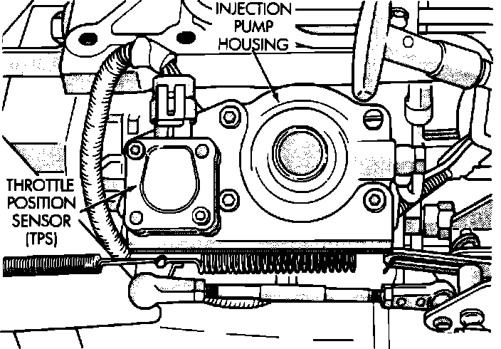 The Throttle Position Sensor's (TPS) input is used to determine when the 3-4 upshift or the 4-3 downshift (automatic transmission with overdrive) should occur. The Throttle Position Sensor (TPS) is located on the top of the fuel injection pump.
