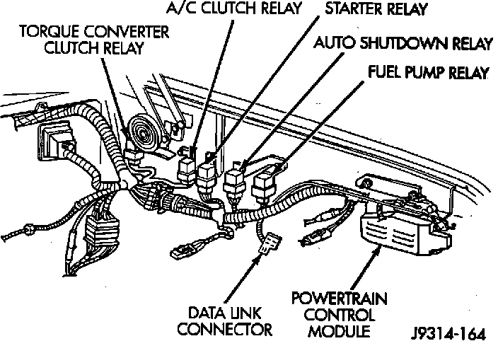 The data link connector breaks out of the Powertrain Control Module (PCM) wiring harness, near the PCM.